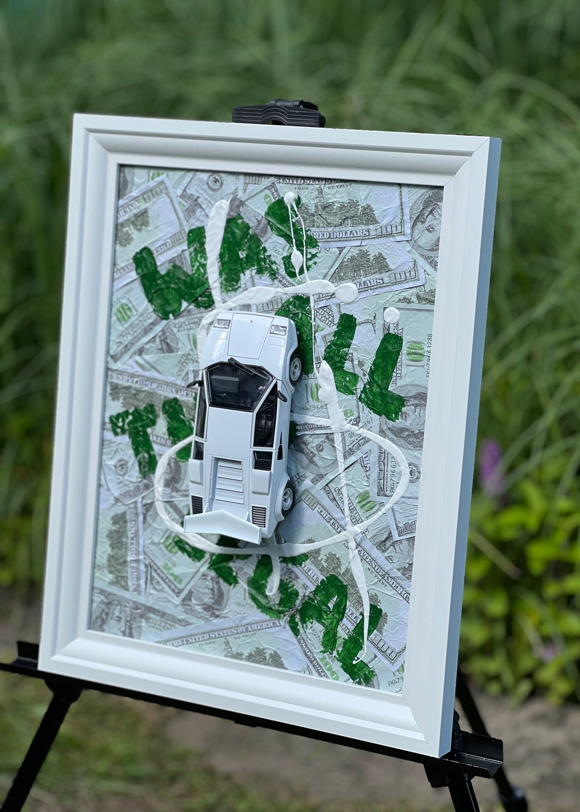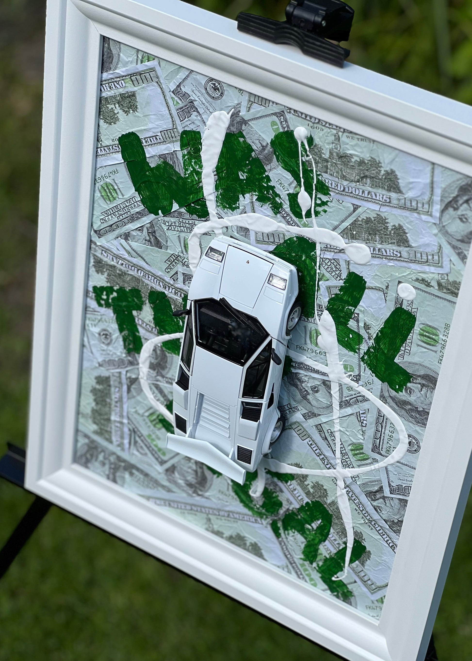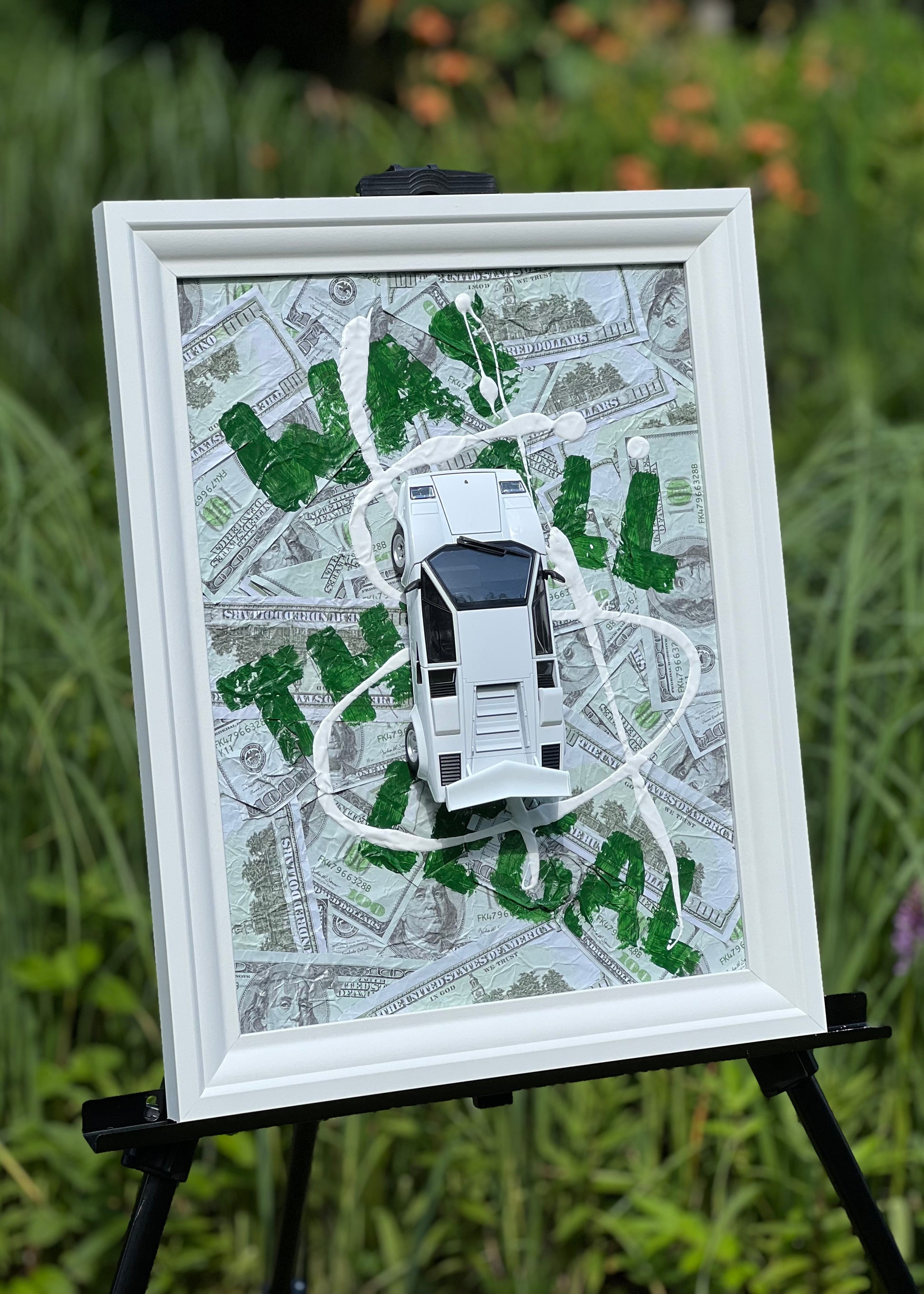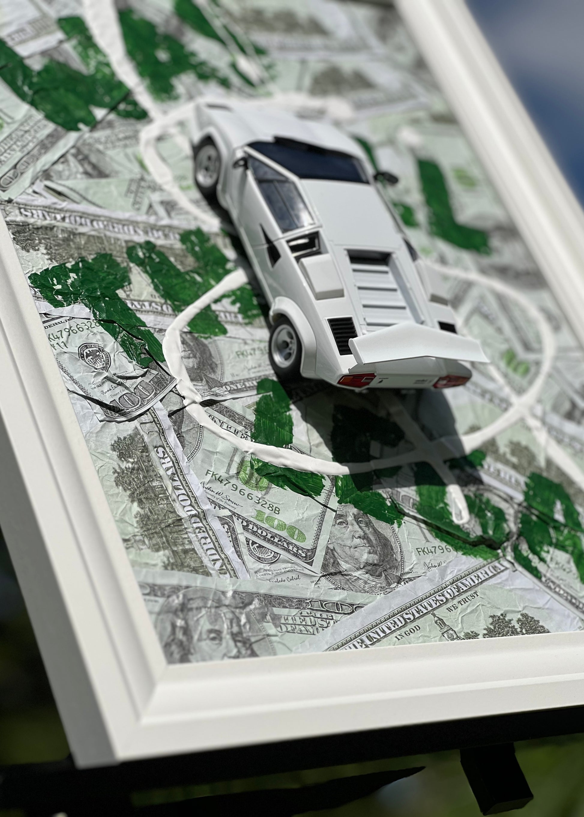 Dieses Kunstwerk, inspiriert von "The Wolf of Wall Street", präsentiert den legendären weißen Lamborghini Countach als Symbol für Macht und Exzess. Das Modellauto des Countach dominiert die Szene, während es auf einem Hintergrund aus Geldscheinen ruht, auf denen in grüner Schrift die berühmte Frage "WAS ALL THIS LEGAL" prangt.