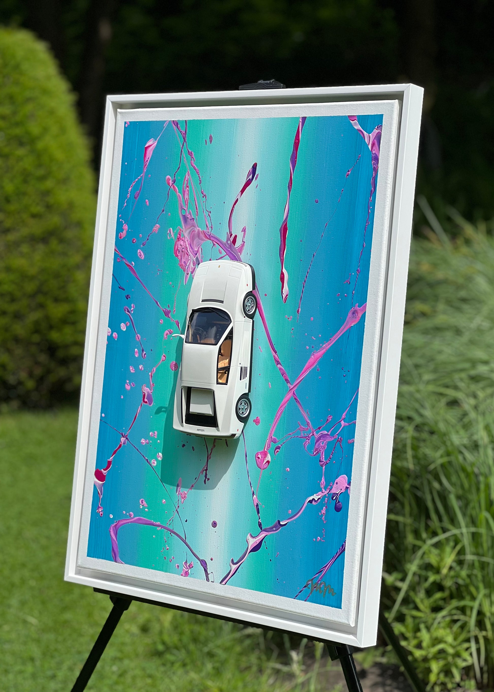Der Hintergrund des Gemäldes ist in den typischen Farben von Miami Vice gestaltet, die den strahlend blauen Ozean und die wilden Rosatöne der 80er Jahre perfekt einfangen. Die dynamischen Spritzer und lebhaften Farben verleihen dem Bild eine energiegeladene Atmosphäre, die an die aufregende und pulsierende Zeit der 80er Jahre erinnert.