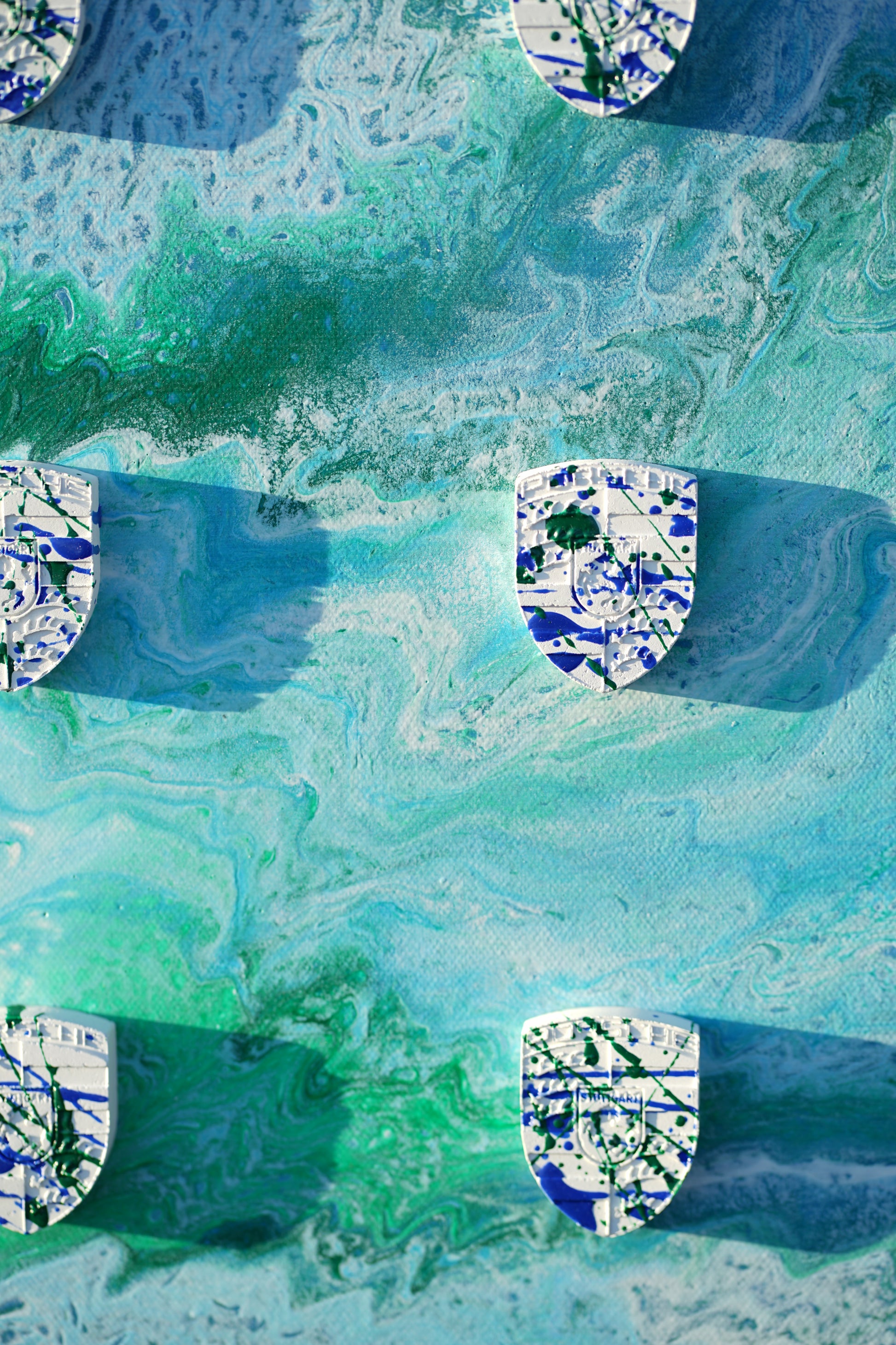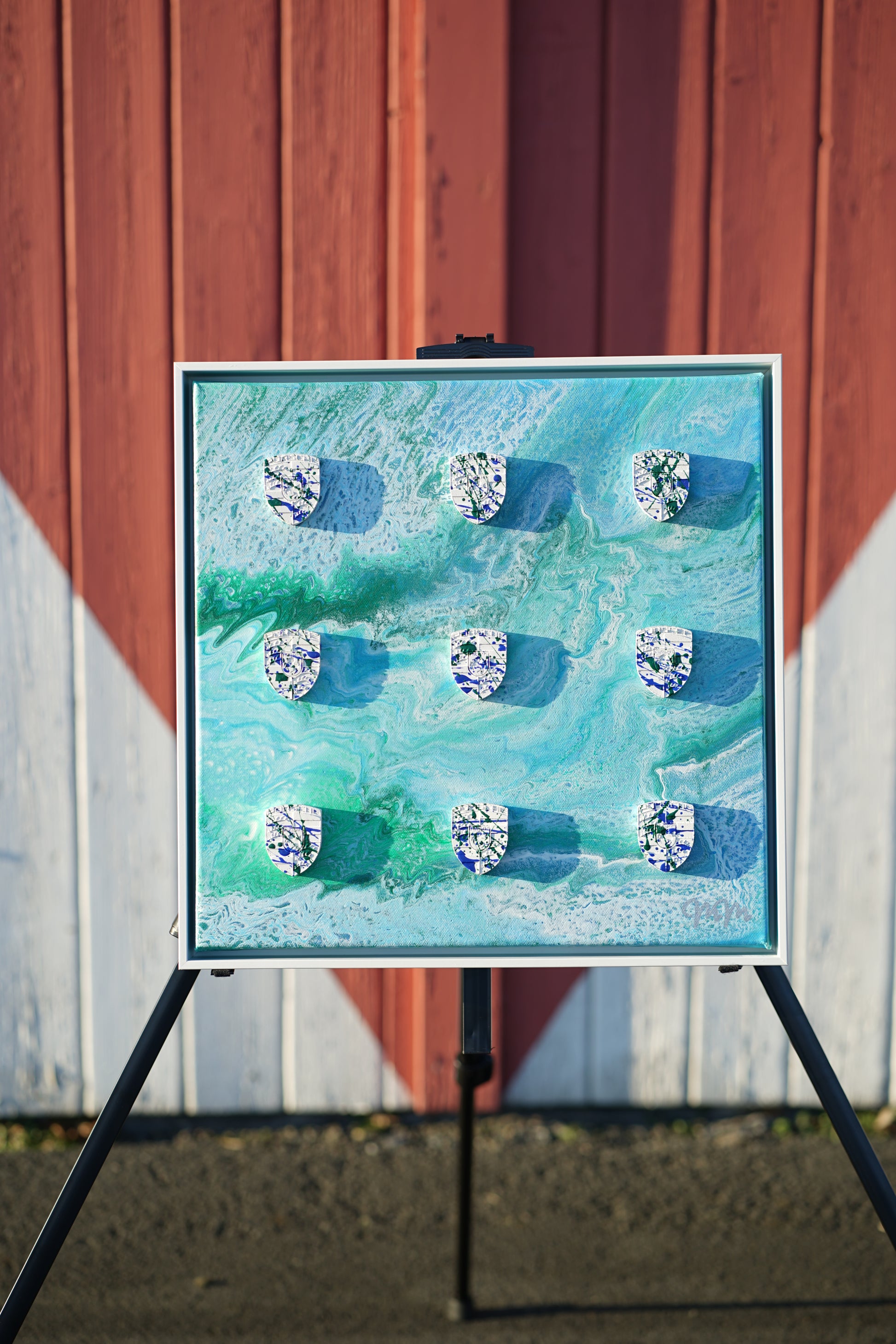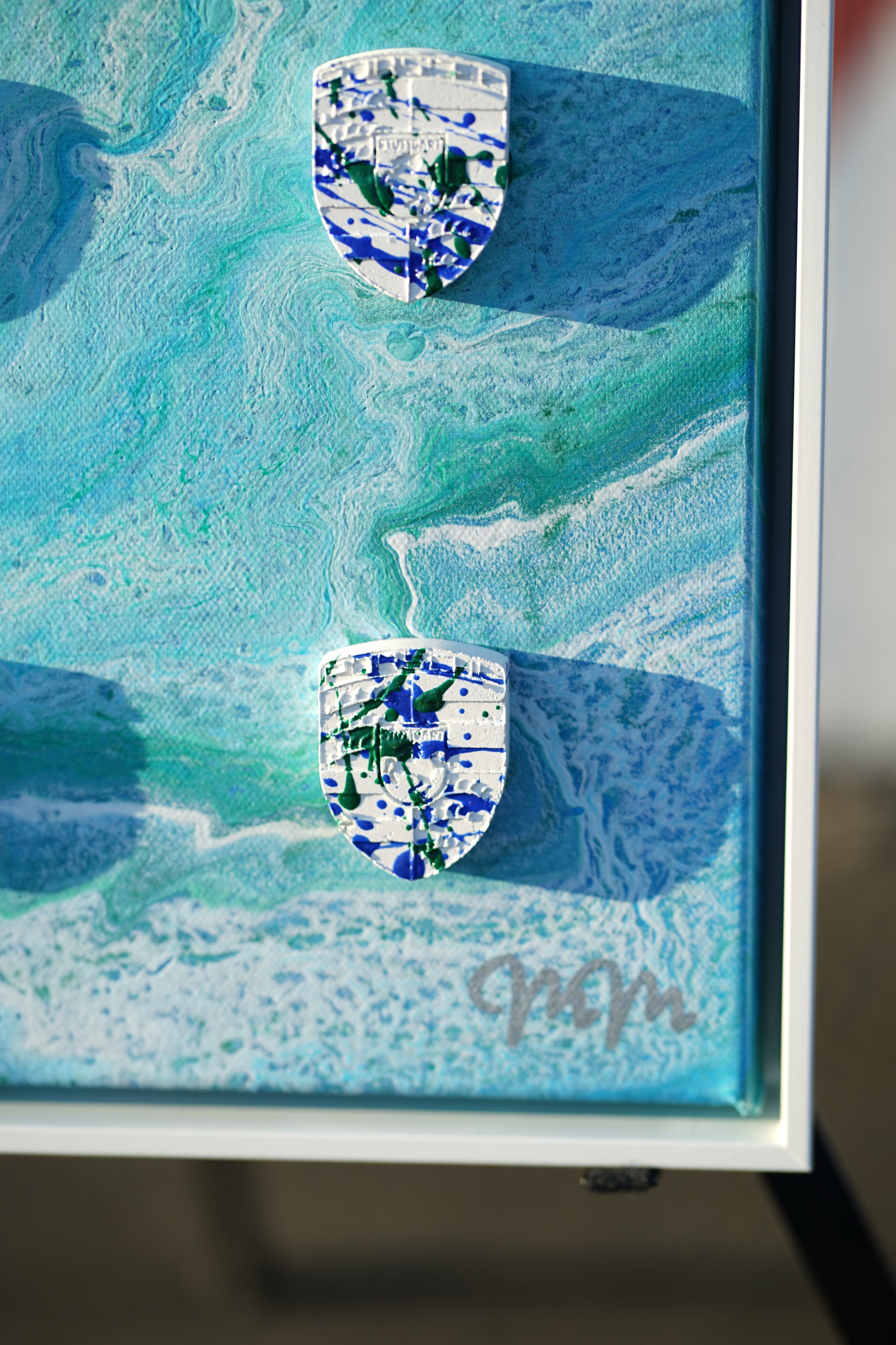 Der Hintergrund besteht aus intensiven Blau- und Grüntönen, die Tiefe und Kontrast schaffen. Diese leuchtenden Farben verleihen dem Werk eine elektrisierende Atmosphäre und lassen die Porsche-Wappen noch kraftvoller hervortreten. Die Kombination aus präzisen, klaren Formen und den frei gesetzten Farbakzenten erzeugt ein spannendes Wechselspiel zwischen Ordnung und kreativer Freiheit.