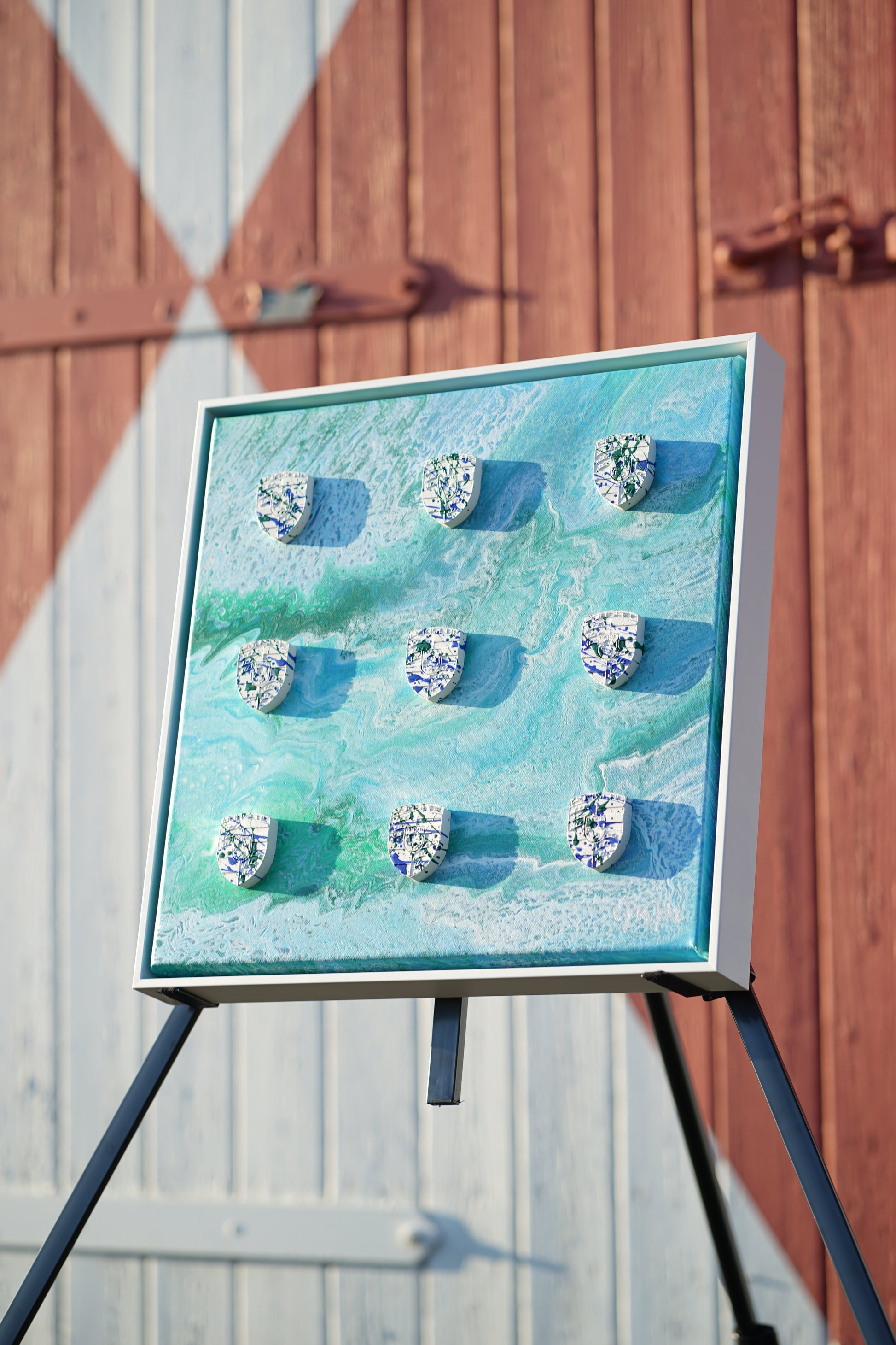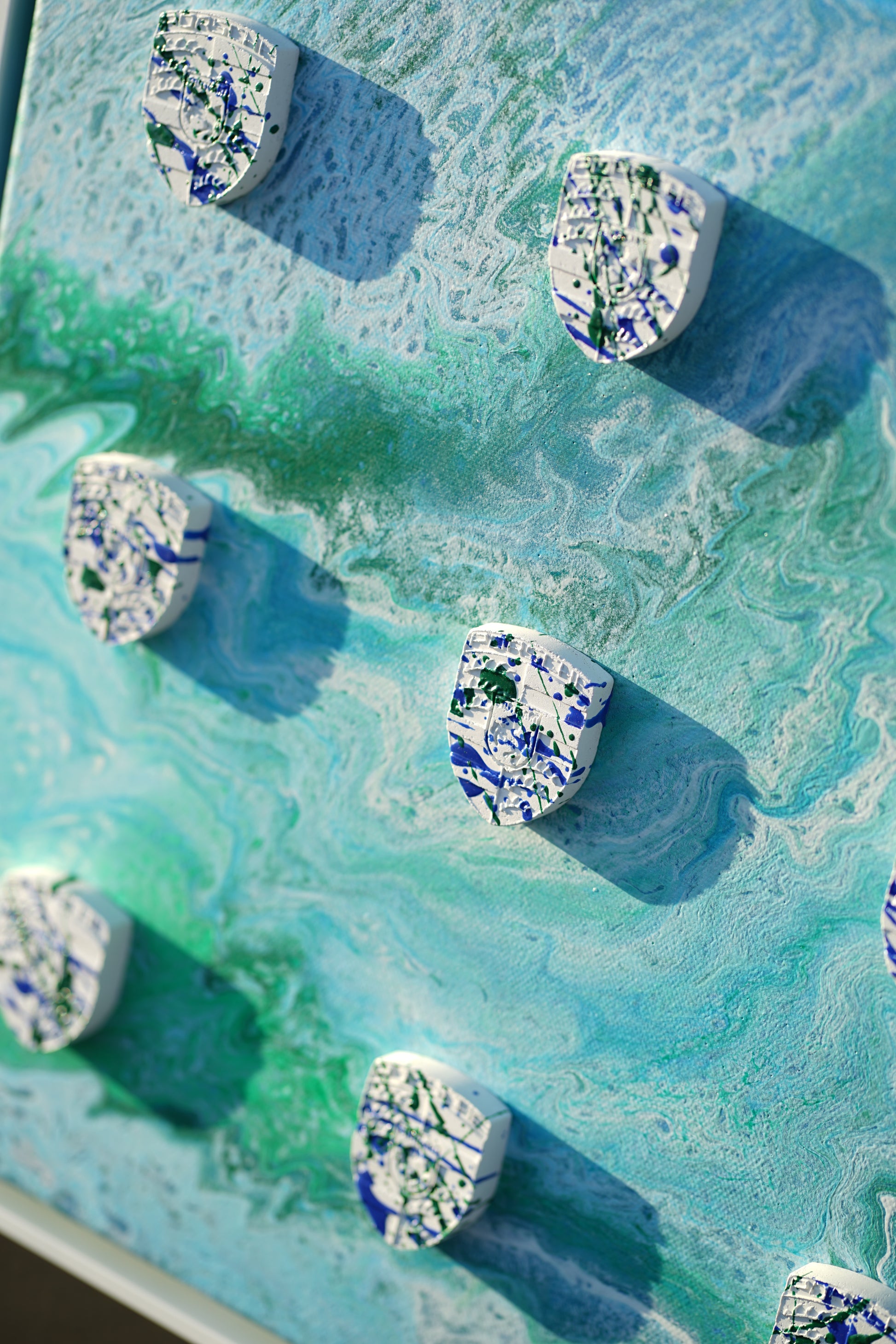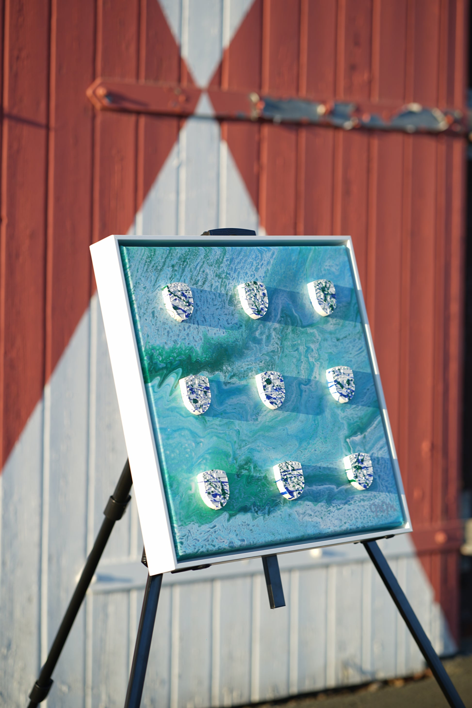 Der Hintergrund besteht aus intensiven Blau- und Grüntönen, die Tiefe und Kontrast schaffen. Diese leuchtenden Farben verleihen dem Werk eine elektrisierende Atmosphäre und lassen die Porsche-Wappen noch kraftvoller hervortreten. Die Kombination aus präzisen, klaren Formen und den frei gesetzten Farbakzenten erzeugt ein spannendes Wechselspiel zwischen Ordnung und kreativer Freiheit.